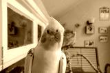 Adult male Cockatiel seen closing his outs, resting on the outside of his cage, with his female companion seen out of focus in the background, seen in a conservatory.