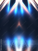 Empty background scene. Dark street reflection on wet asphalt. Rays of neon light in the dark, neon shapes, smoke. Background of an empty stage show. Abstract dark background.