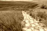 Idyllic view of the rolling hills of the Yorkshire Dales seen from a high vantage point and a public footpath made up of stone slabs.