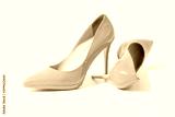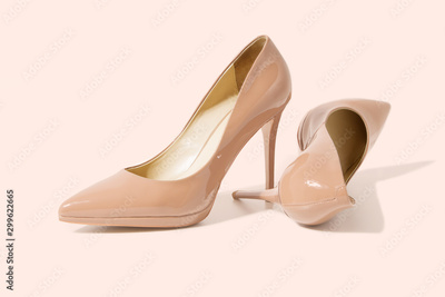 Woman Shoes . High heels closeup. Top view. Women fashion. Ladies accessories. Girly casual formal shoe isolated. pink background. Footwear on floor. Copy space, mockup. flat lay Selective focus