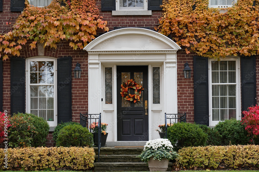 Front door of traditional brick house with fall wreath surrounded by ivy with fall colors