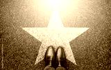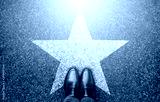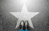 Success in business design concept. Businessman standing on street road background. Top view. Selfie of feet in black leather shoes and white star symbol on pathway floor. New talent or champion.