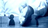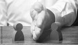 The person divides with the palm the red and green figures of people. Orbiter, the solution of controversial issues and conflicts of interest. Stop the conflict, the mediator. Dispute resolution.