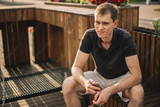 Young man using phone and drink coffee sitting on the street.