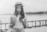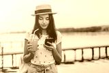 Beautiful young woman walking with phone and orange drink on pier at sunset in summer.