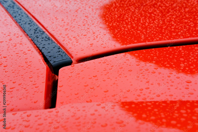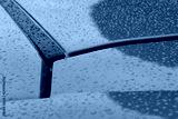 Newly built hybrid motor vehicle showing detail of the rear roofline, seen just after a rain shower.