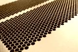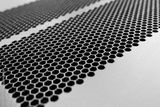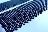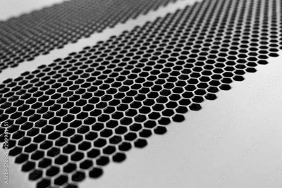 Close-up, shallow focus of a meshed style cooling panel used on a main frame computer, housed in a data centre. The honeycomb holes aid active venting of hot air within the computer.