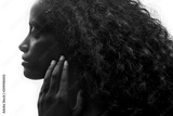 Close up portrait of an attractive dark skinned woman with long hair and strong features, black and white