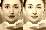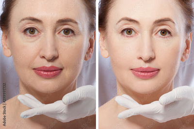 Close up woman face before after lifting injection. Middle age lady before-after wrinkled skin, eye bags, nasolabial folds. Face plastic surgery, collagen anti aging cosmetic procedure. Menopause