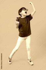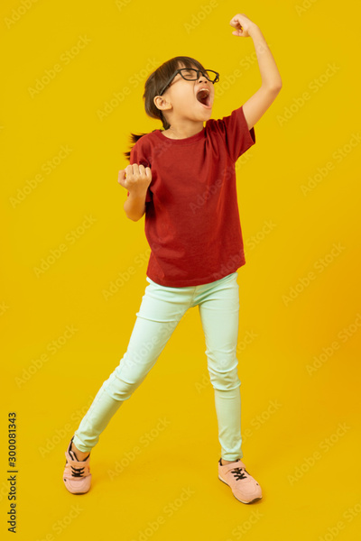 Portrait of Asian pretty girl celebrating and raising hand up for successful, Thai kid with glasses in red shirt have glad and joy on yellow in studio