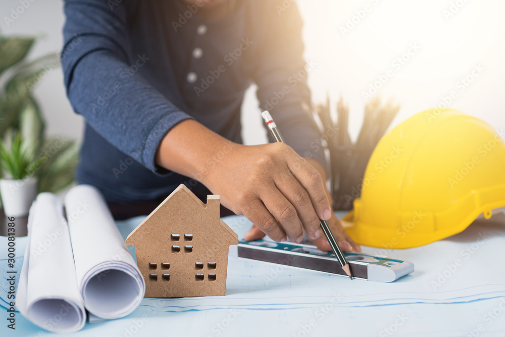 architect working and planning on blueprint, Engineering objects on workplace with laptop