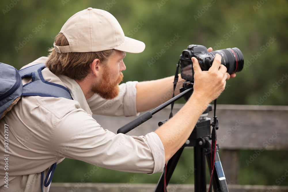 A lonely man in yellow jacket exploring rural area in Lithuania. Agricultural scene of rapeseed and dramatic storm clouds above. Autumn scenery.