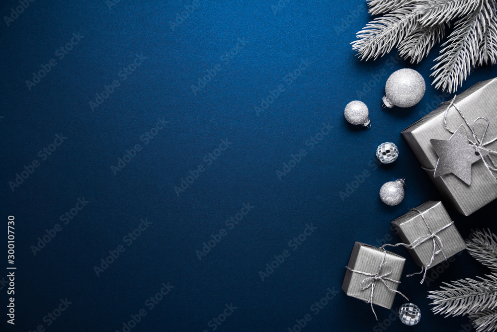 Merry Christmas and Happy Holidays greeting card, frame, banner. New Year. Noel. Christmas ornaments and gift on blue background top view. Winter xmas holiday theme. Flat lay