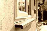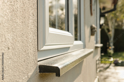 Shallow focus of newly installed, double glazed windows installed into detached work office. Showing part of the large garden and wall ornaments.
