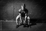 Young strong fit muscular sweaty man with big muscles strength cross workout training with dumbbells weights in the gym dark image with shadows real people black and white