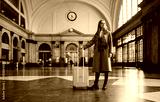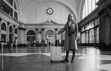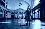 Tourist woman with suitcase on platform station in Barcelona photo on retro camera. Girl traveler waiting train enjoy holiday weekend vacation in transport railway. Travel railroad station concept