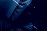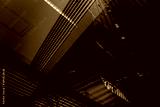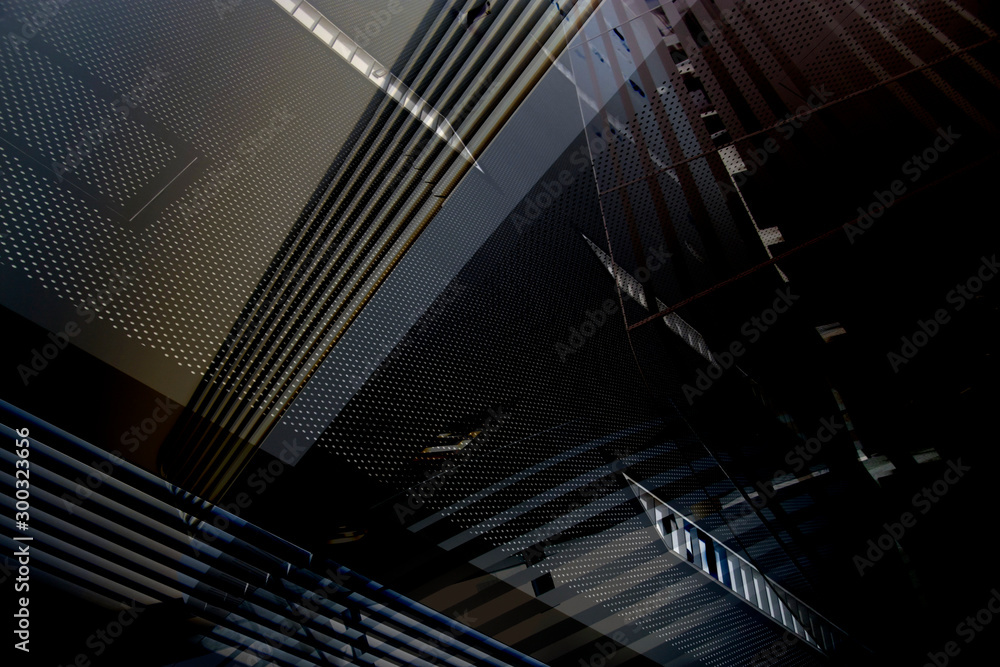 Collage photo of modern office architecture in darkness. Generic architectural elements. Grunge structure of building interior with lath ceiling and perforated metal panels.