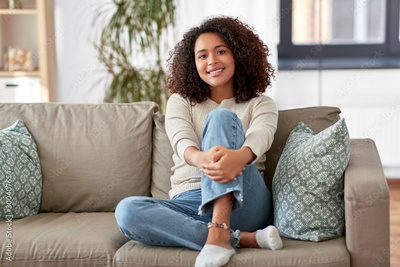 people, race, ethnicity and portrait concept - happy african american young woman sitting on sofa at home