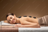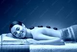 wellness, beauty and relaxation concept - smiling beautiful young woman having hot stone massage at spa