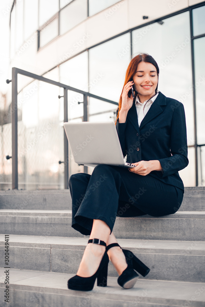 Successful smiling businesswoman or entrepreneur using laptop and talking to the phone sitting in front of his office.