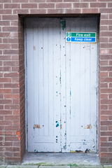 Fire exit keep clear sign on back entrance door at theatre