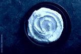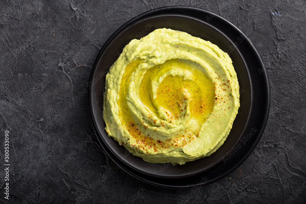 Bowl of green hummus, delicious cream of chickpeas and avocado on a stone background.
