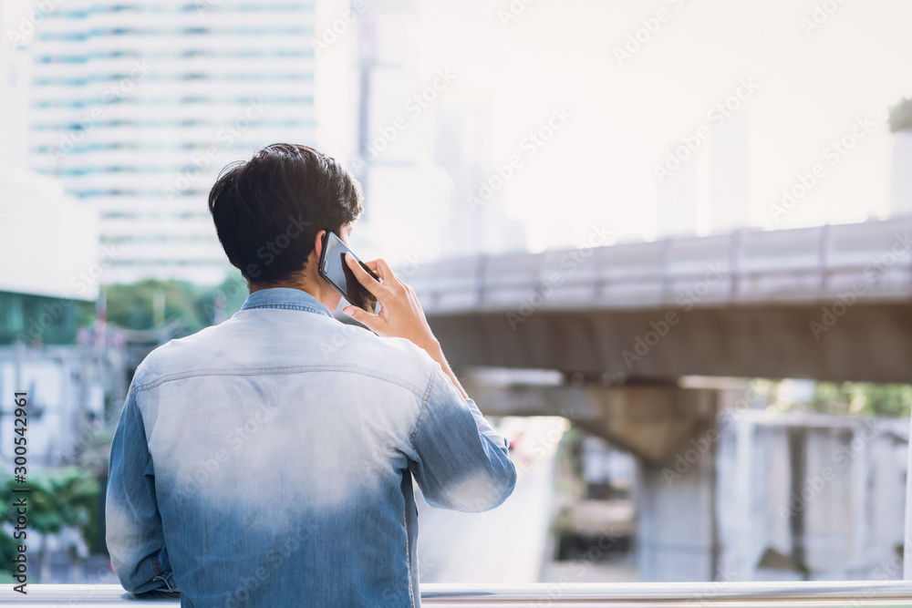 Man calling with smartphone and having talking on outdoor. technology concept.