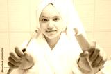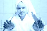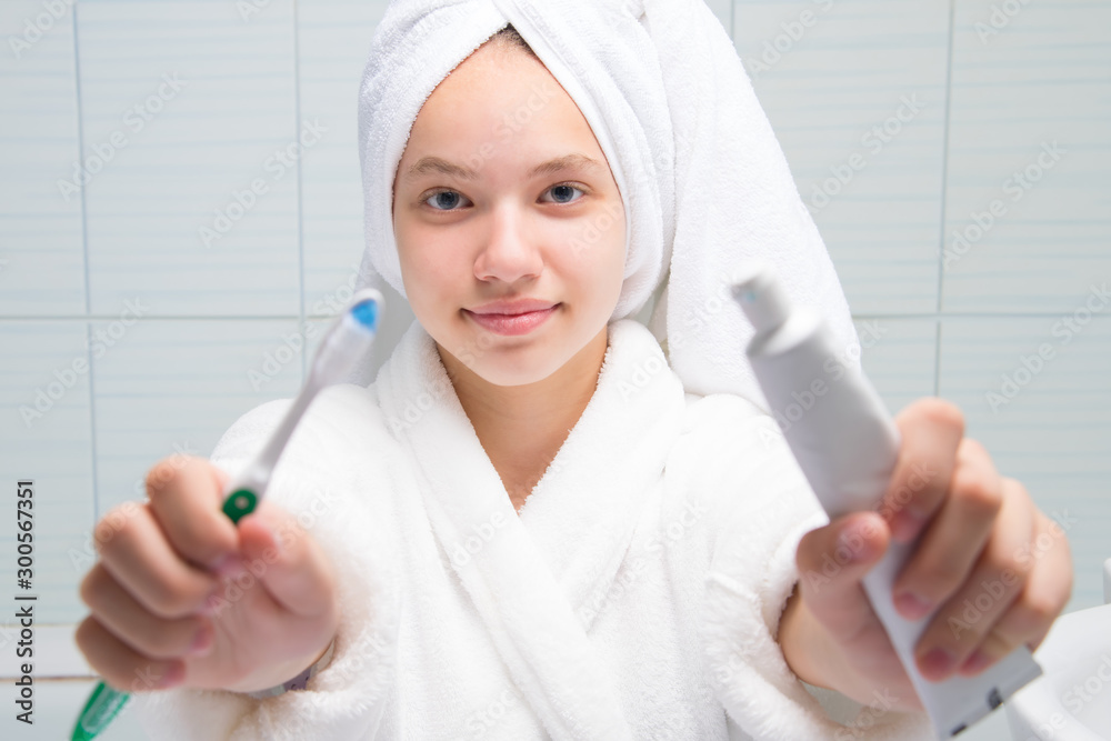 close-up, girls in the bathroom, in a white bathrobe and a towel on her head holding toothpaste and a brush in her hand