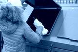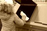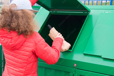 girl in a red jacket, throws a bottle in a paper bag in a dumpster, rear view