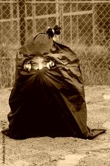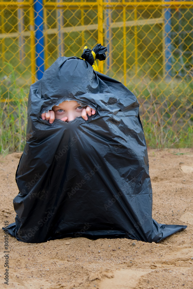 child sitting in a black garbage bag, on the background of a yellow grid, close-up
