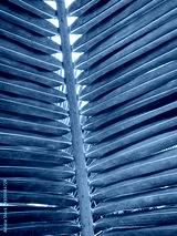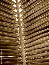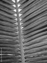 Under coconut leaves and stalk at tropical beach. Closeup palm tree. Coconut leaves pattern. Summer vacation background. Texture green leaf of palm. Tropical environment. Resort decoration.