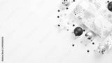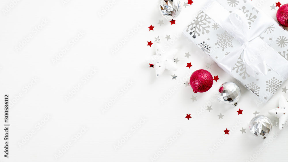 Stylish silver Christmas gift box with ribbon bow and Xmas red decorations on white background with copy space. Winter holidays greeting card template, New Year banner mockup