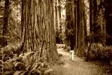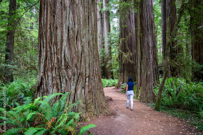 Young girl walking on trail in between massive redwood trees in Northern California forest - Jedediah Smith Redwoods State Park, California, USA