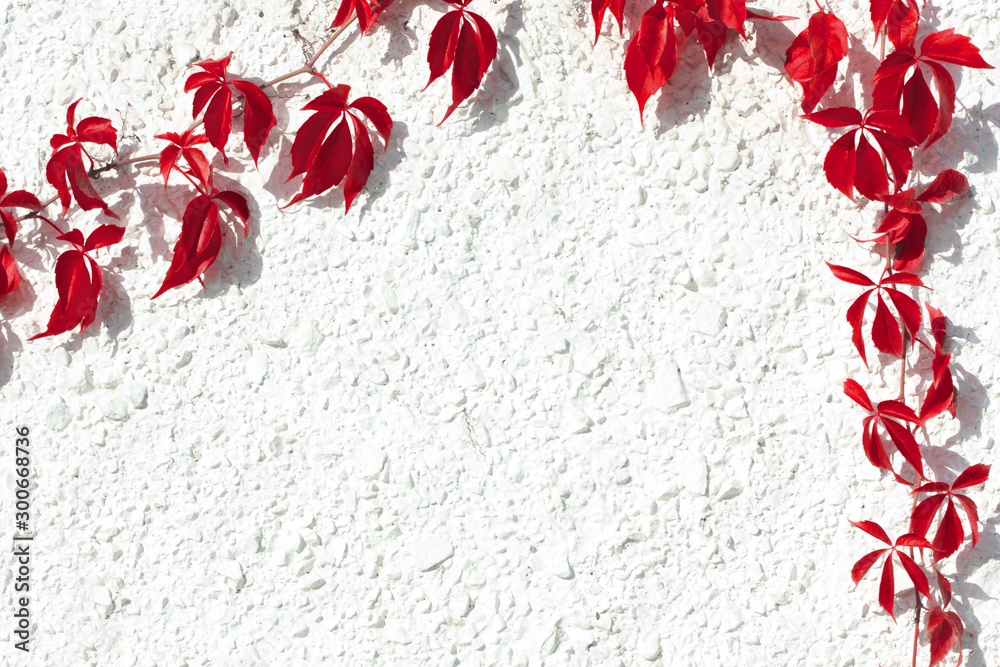 climbing vine with red leaves at white plastered wall in autumn. Concrete and foliage texture