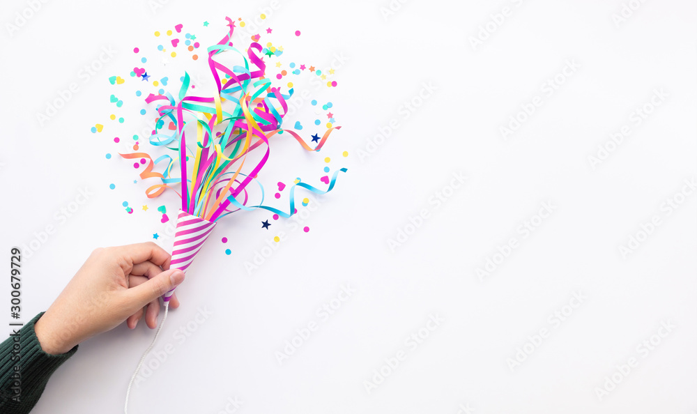 Celebration party and anniversary concepts ideas with woman hand holding colorful confetti,paper art on white color