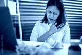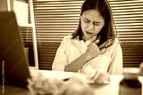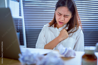 Asian business woman hand pressing on chest with painful expression. Symptoms of heart disease because working too hard.