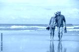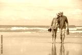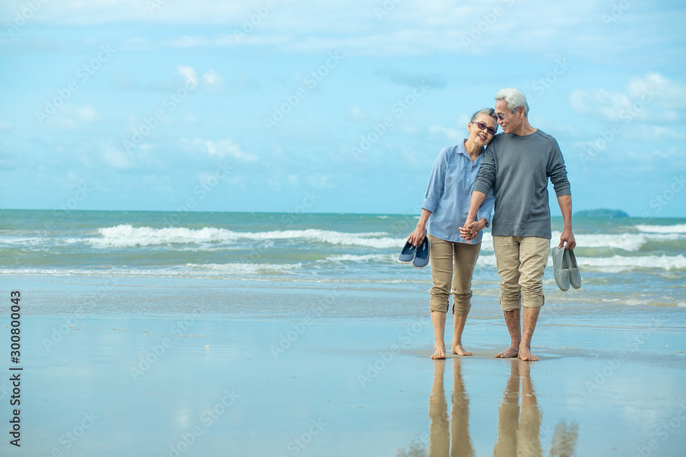 Happy Romantic Middle Aged Couple Enjoying Beautiful Sunset Walk on the Beach. Travel Vacation Retirement Lifestyle Concept