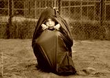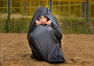 a child sits in a black garbage bag on the sand, against a yellow mesh background