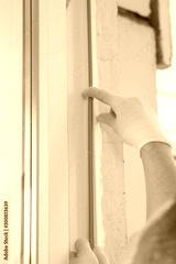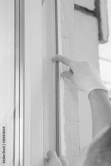 hand worker in a glove, inserts into the frame of the plastic window rubber band to seal