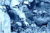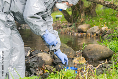 scientist, in a protective suit and mask, collects water from the river for testing, in test tubes