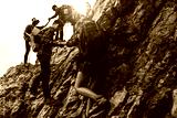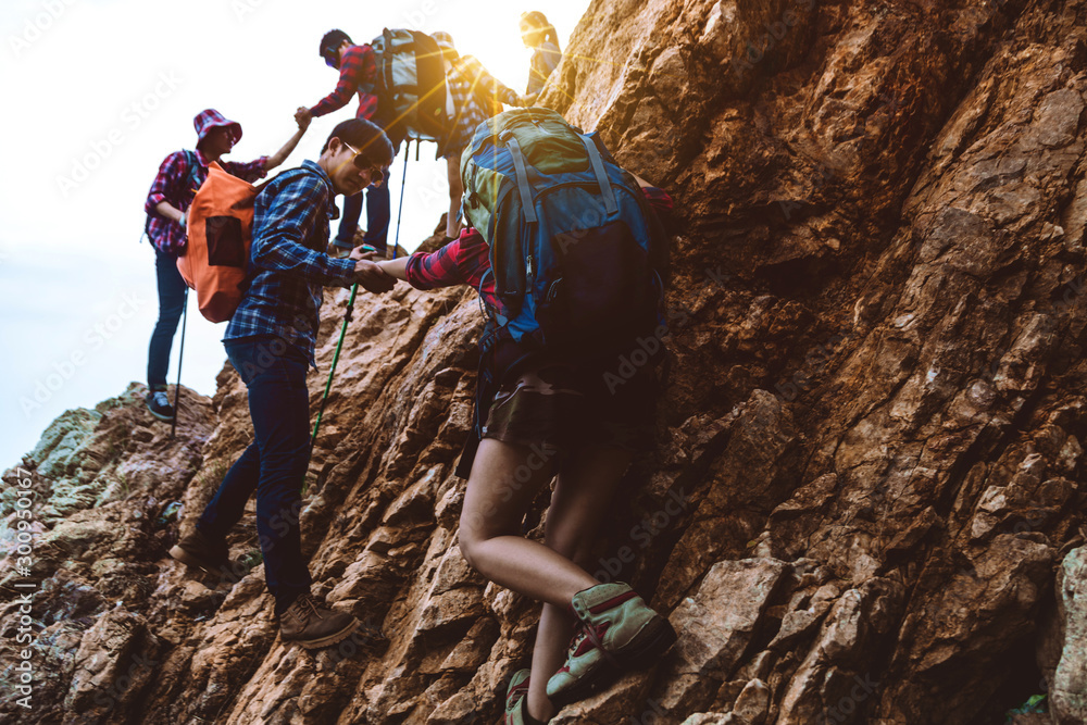 Hiking team, teamwork concept, successful team, successful team standing on the top of the mountain, a team of male and female climbers raised