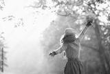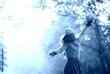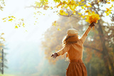 carefree woman with yellow leaves with raised arms rejoicing