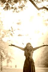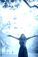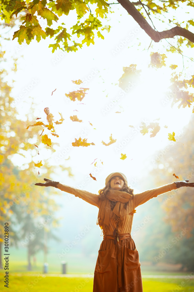 happy woman enjoying autumn and catching falling yellow leaves