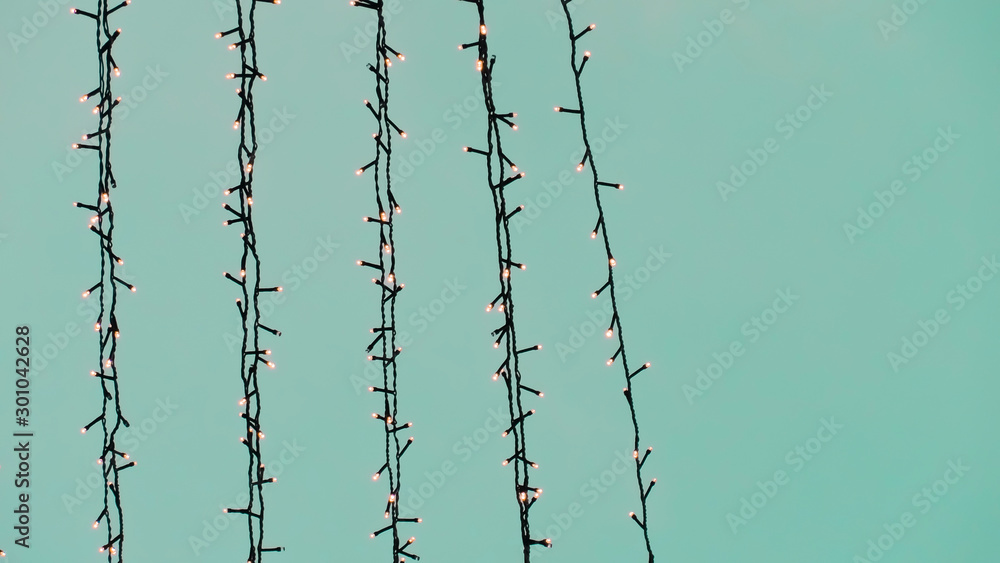 Strands of Christmas Lights Askew against a Solid Turquoise Background