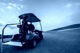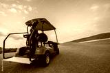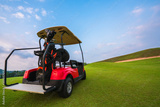 Rear view Red golf cart on green lawn with blue sky and cloud for background backdrop use