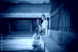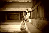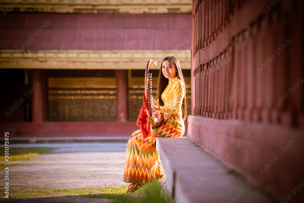 A beautiful asian model wearing dress traditional posing smile with play musical instrument in Mandalay palace , Myanmar.