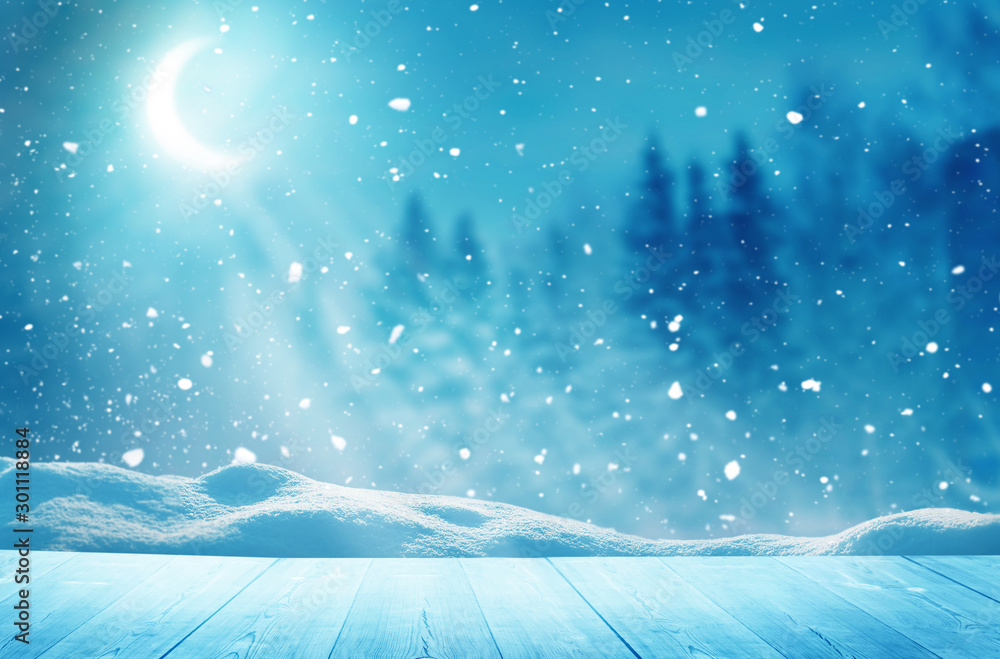 Merry christmas and happy new year greeting background with table .Winter landscape with fir tree branch