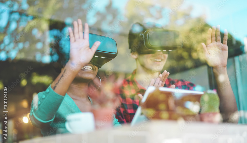 Young students using virtual reality goggles in modern coworking bar - Window reflection view - Millennials people having fun with vr technology - Future and digital concept - Focus on girl headset