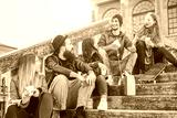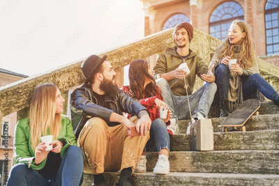 Happy st friends drinking coffee take away and laughing in old downtown city center - Young people having fun together - Millennial, youth, lifestyle and z generation concept - Focus on two right guys