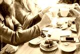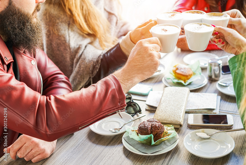 Young students drinking coffee and doing breakfast in bar bakery shop - Group of people having cappuccino and eating muffins at university break - Friendship, morning break concept - Focus on man hand
